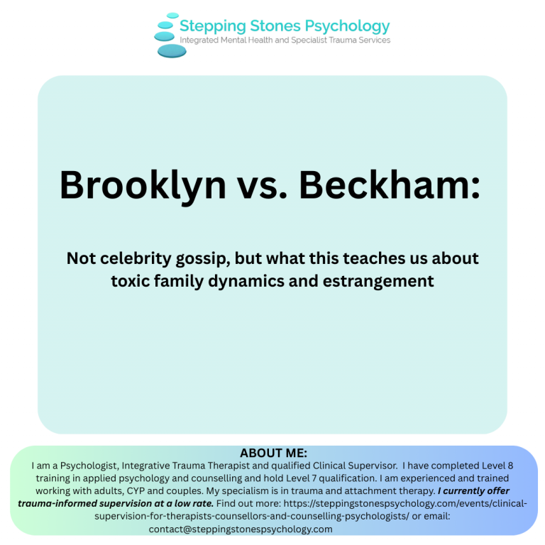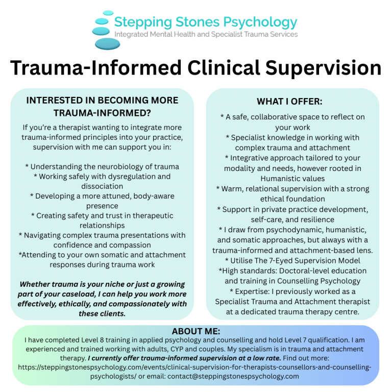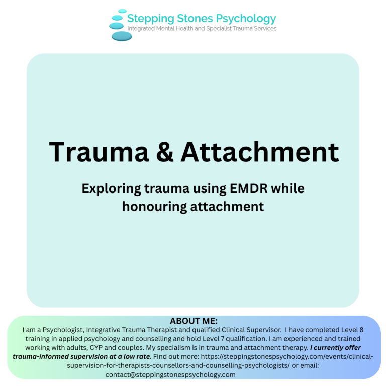 Our core specialism is in trauma and attachment. We work with individuals of all ages who have experienced abuse, neglect, domestic violence, PTSD/CPTSD, complex trauma, developmental trauma, loss, attachment difficulties, or who need support with therapeutic parenting.The 'We' and the 'I' behind Stepping Stones Psychology: